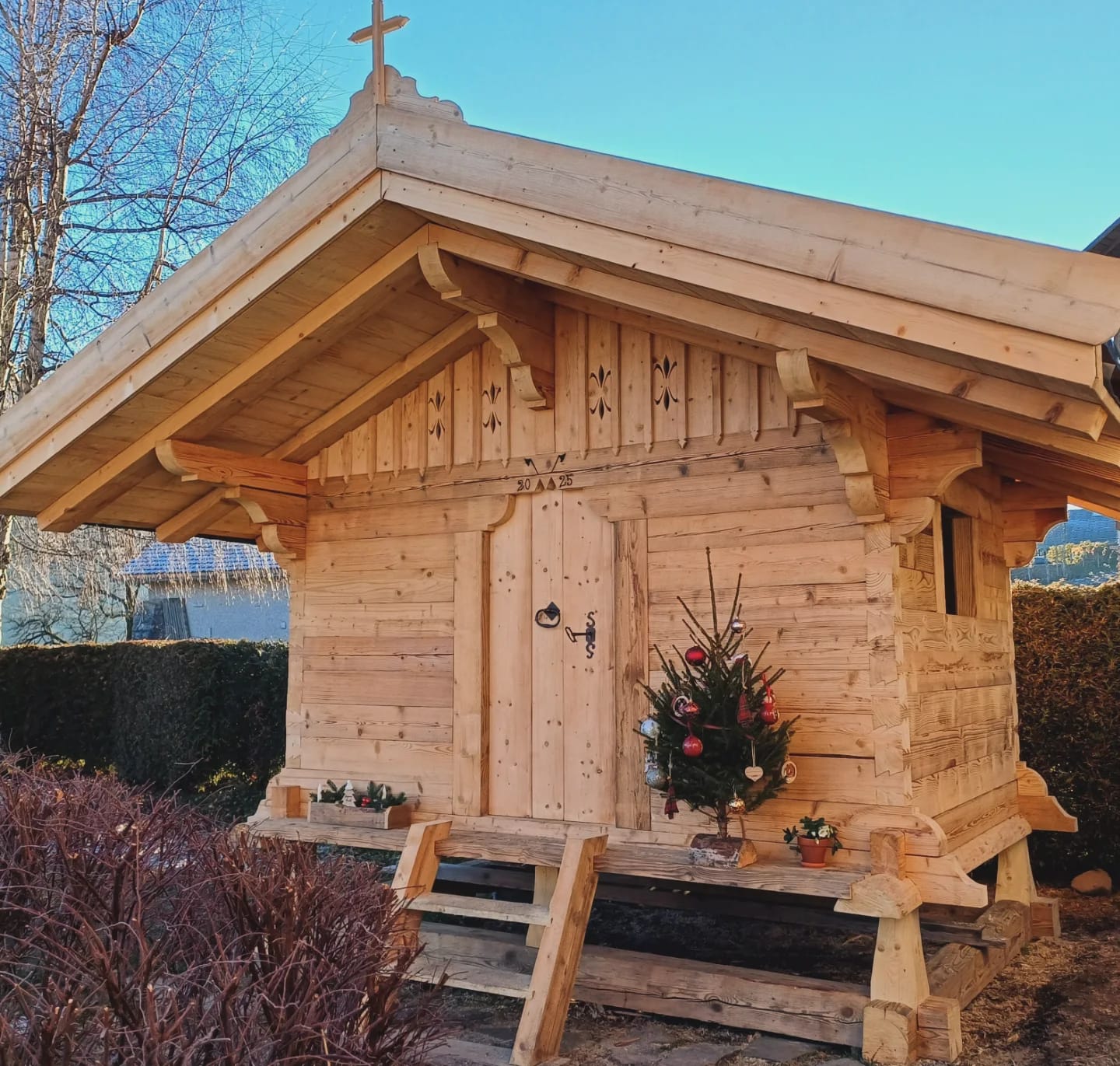 Mazot fabriqué selon la méthode fuste, reprenant une forme typique de chalets norvégiens ‘Stabbur’.